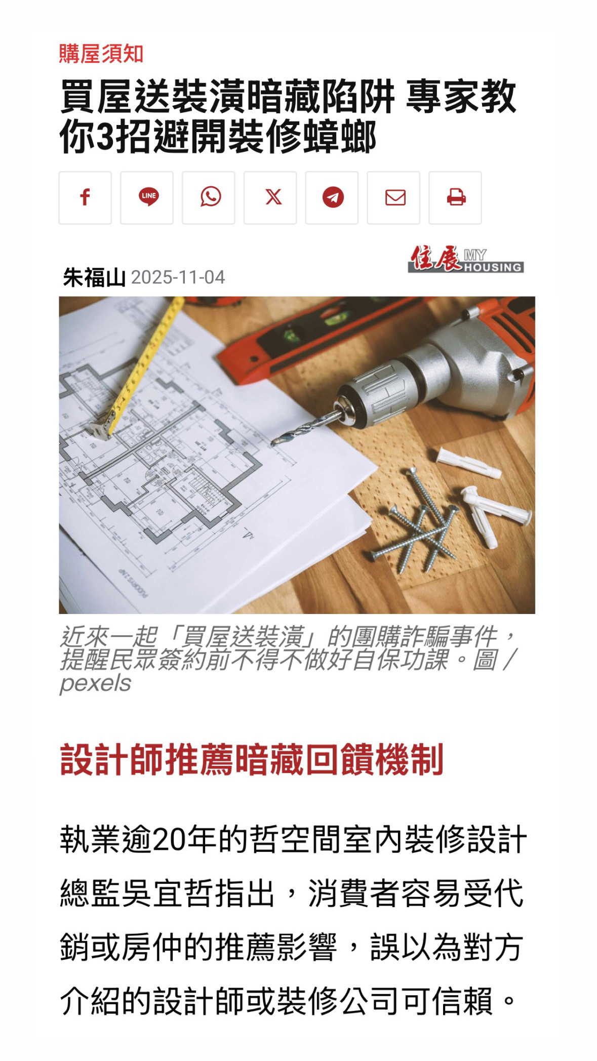首先,確認廠商是否具備「室內設計」與「裝修工程」雙牌照。其次,接洽的設計師本人是否擁有「室內設計」與「裝修工程」雙證照。最後,簽約公司與實際負責設計師是否一致。他強調:「光是能做到以上3點,就能避開80%以上的裝修蟑螂。」